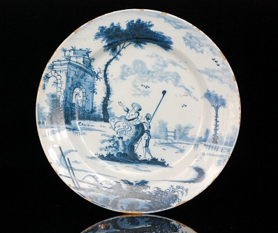 A late 18th Century Delft tin glazed charger decorated with a lady sat upon a branch with her male companion by her side, set amidst a castle ruins with a lake in the foreground and trees in the distance, unmarked, diameter 33.5cm, A/F