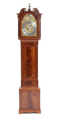 A late 18th century mahogany long-case clock, door flanked by fluted columns, arched brass dial with silvered chapter ring and fully engraved centre, clockwork with date, second and stike/silent. Signed Matthew Wylie, Paisley. H. 224 cm.