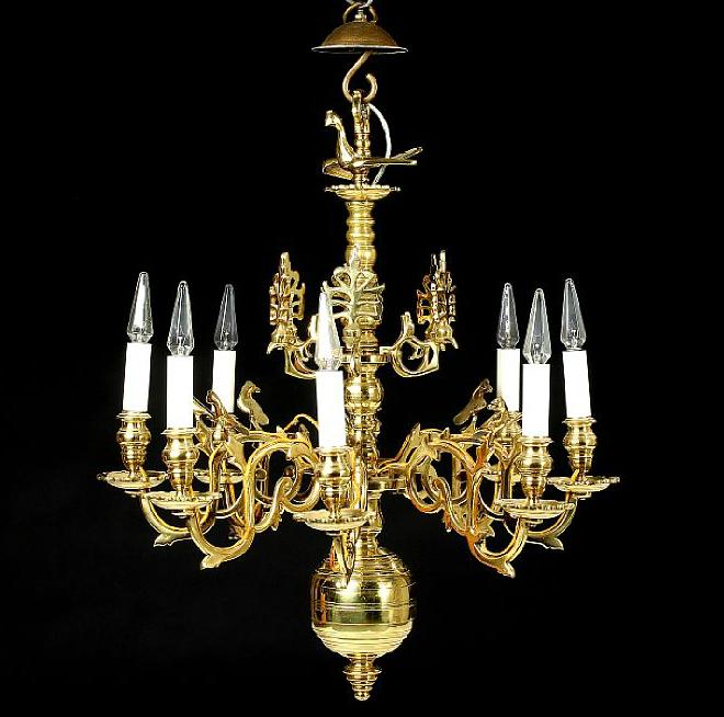 A late 19th century eight-light brass chandelier, decorated with birds and foliage
