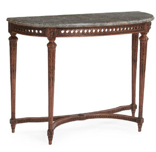 A late 19th century French carved fruit wood console, greyish marble top