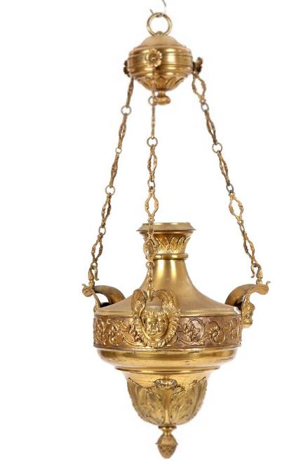 A late 19th century gilded brass ceiling lamp decorated with putti and foliage