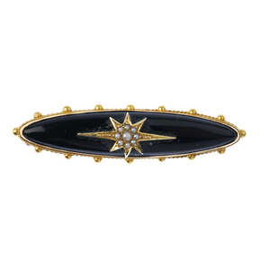 Designed as a marquise-shape onyx set to the central star-shape with split pearls, to the beaded and rope-twist surround and glazed panel to the reverse. Length 4.5cms. Weight 6.9gms.