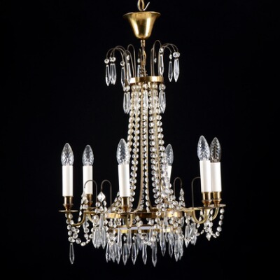 A late 19th century partly gilded brass Empire style six-light chandelier with blue glass bottom