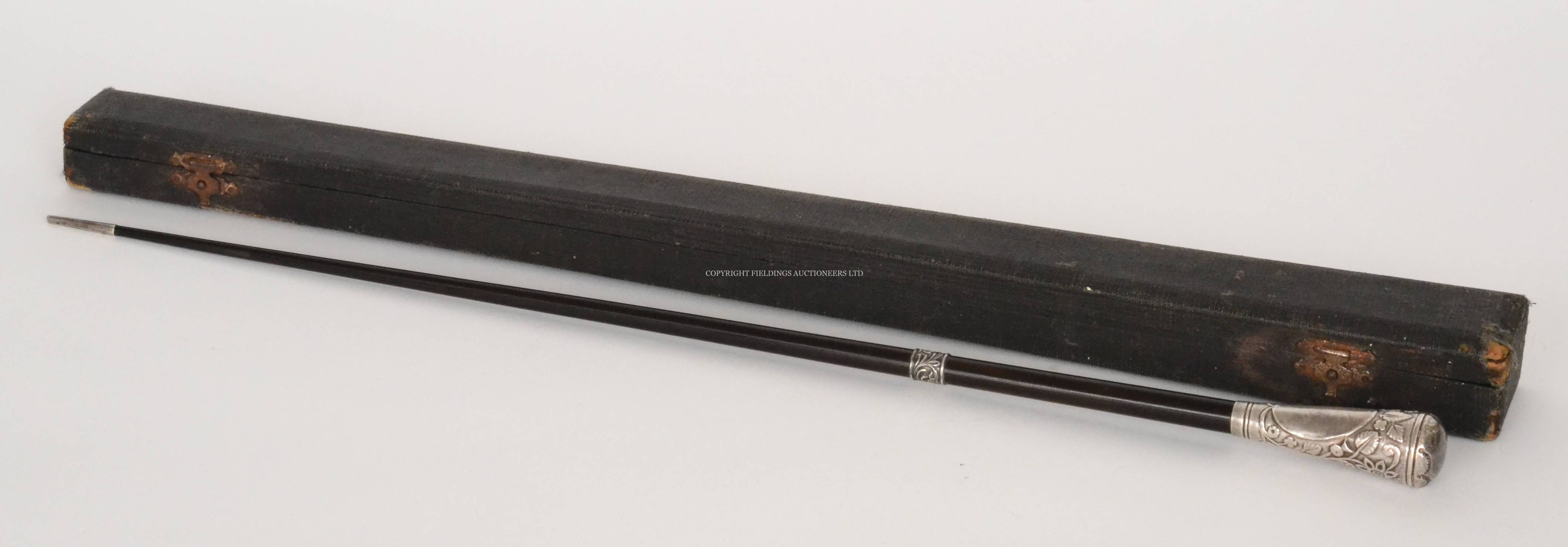 A late 19th Century silver mounted rosewood conductor's baton decorated with embossed foliate scroll details, length 46cm within original case.