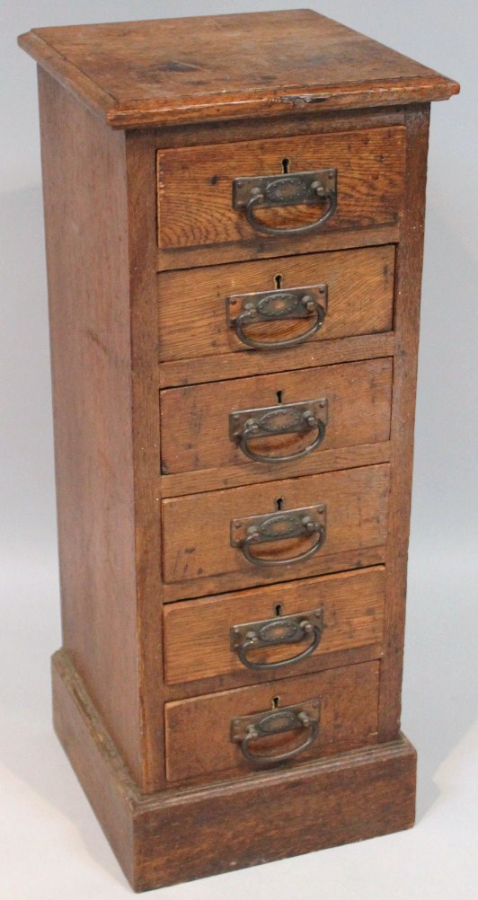 of small proportion, with six spice drawers with plate back handles and English leaver locks, with an overhanging top on a plain block base