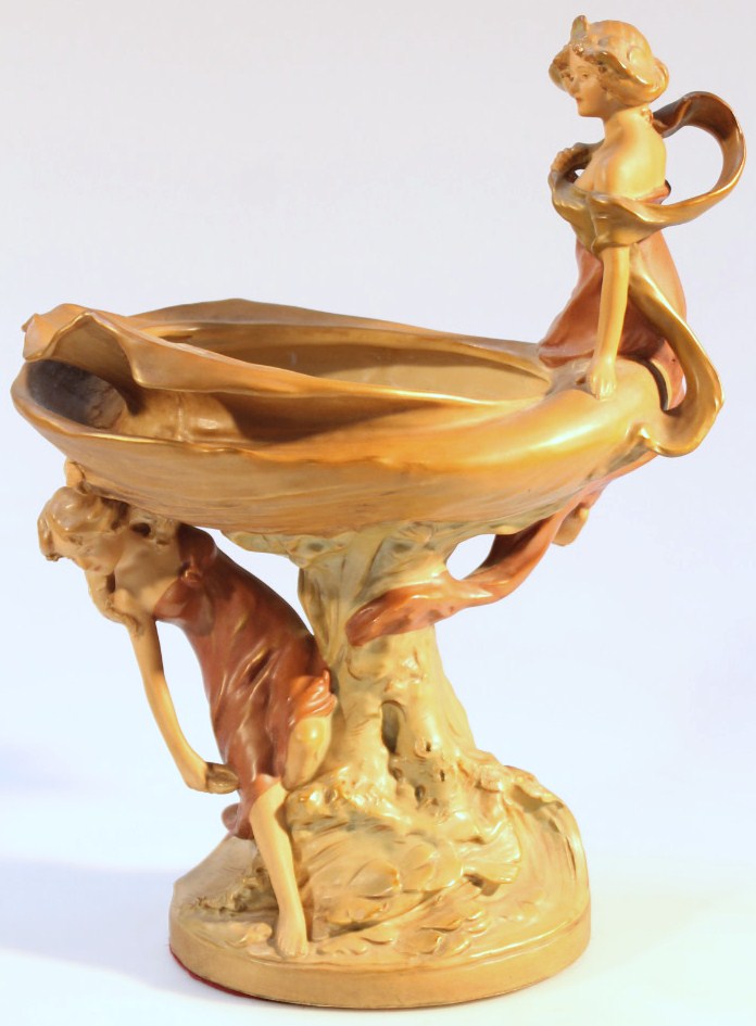 A late 19thC/early 20thC Royal Dux centrepiece, formed as a lady in flowing robes overlooking an oval well, raised on a naturalistic stem set with another figure, terminating in an oval foot, pink triangle mark beneath, 43cm high.