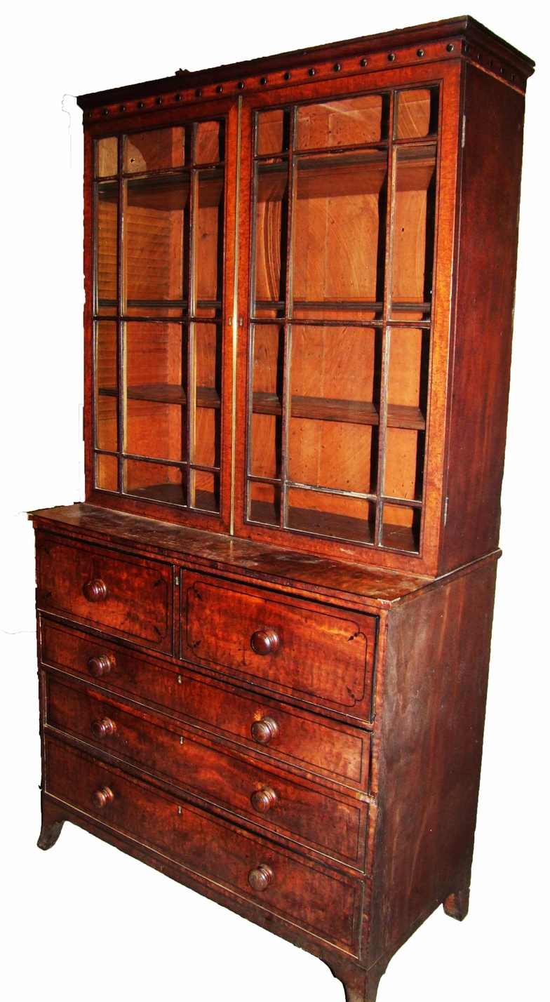 A late Georgian plum pudding and ebony inlaid secretaire cabinet bookcase