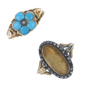 The first set with a rose-cut diamond and turquoise cabochons, the second set with rose-cut diamonds to the vacant centre. Total weight 4.9gms.