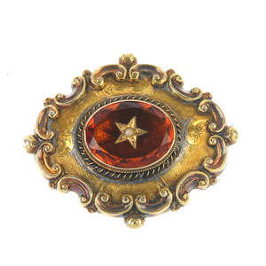 The central oval-shape citrine with star set with split pearl to its centre, to the scrolling surround. Length 3.6cms. Weight 7.7gms.