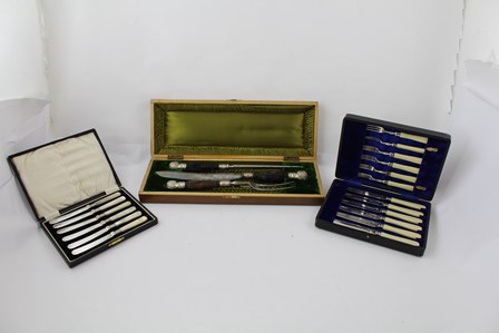 A LATE VICTORIAN SILVER MOUNTED HORN HANDLED CARVING SET comprising carving knife, fork and steel, in a silk and velvet lined oak case, Sheffield 1892, together with TWO CASES OF KNIVES