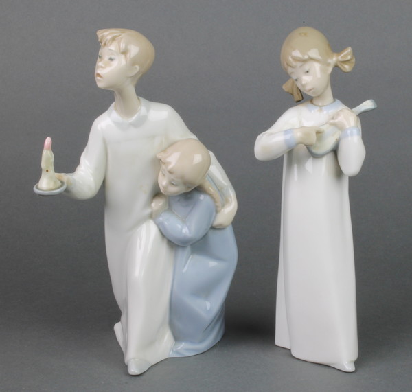 A Lladro figure of a girl playing a mandolin 8" and a Lladro group of a young boy and girl with chamber stick