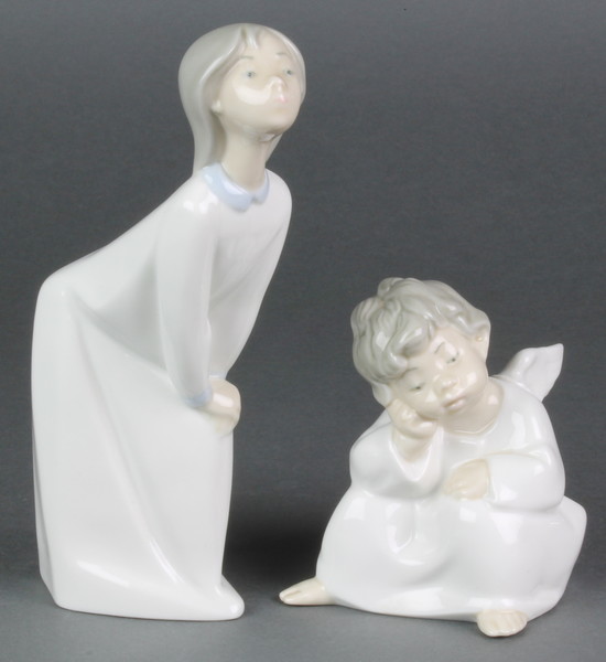 A Lladro figure of a seated angel A/100 4" and a Lladro figure of a girl in nightdress 0/20E 8"