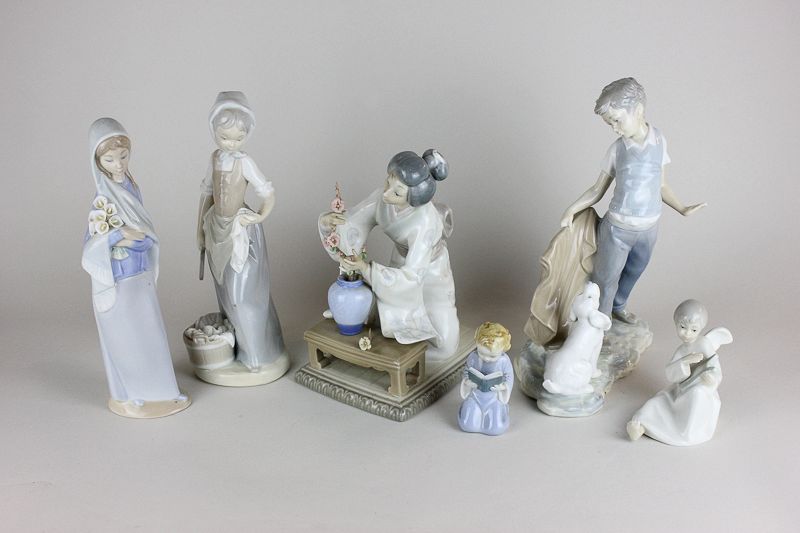 A Lladro porcelain figure of a Japanese woman arranging flowers, in original box, another of a girl standing holding flowers, 23cm, a Nao figure of a boy and dog, 25cm, laundry girl, and two unmarked similar figures