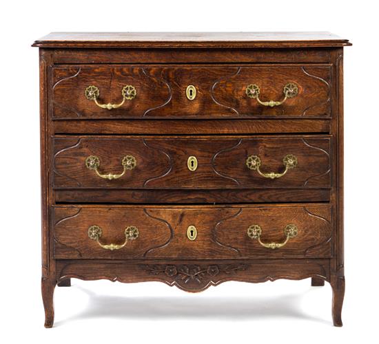 having a molded rectangular top over the case fitted with three long drawers above a shaped apron, raised on cabriole forelegs.