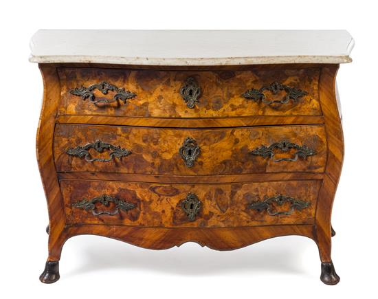 having a later serpentine front marble top over a bombe form case with three drawers, raised on splayed legs ending in stylized hoof feet.