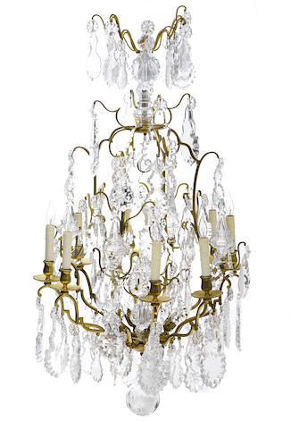 A Louis XV style gilt metal and cut glass eight light chandelier