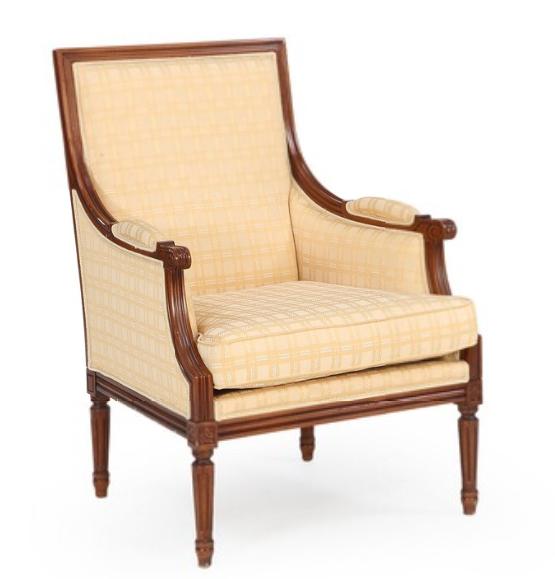 A Louis XVI style mahogany bergere with yellow chequered cover