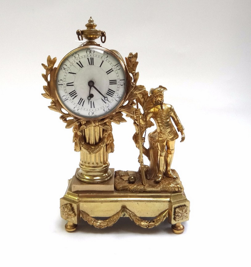 the drum case with enamel dial set atop a fluted column, next to a Victorian hunting figure in period dress with a dog at his feet, on a canted rectangular base adorned with foliate swags (a.f.)