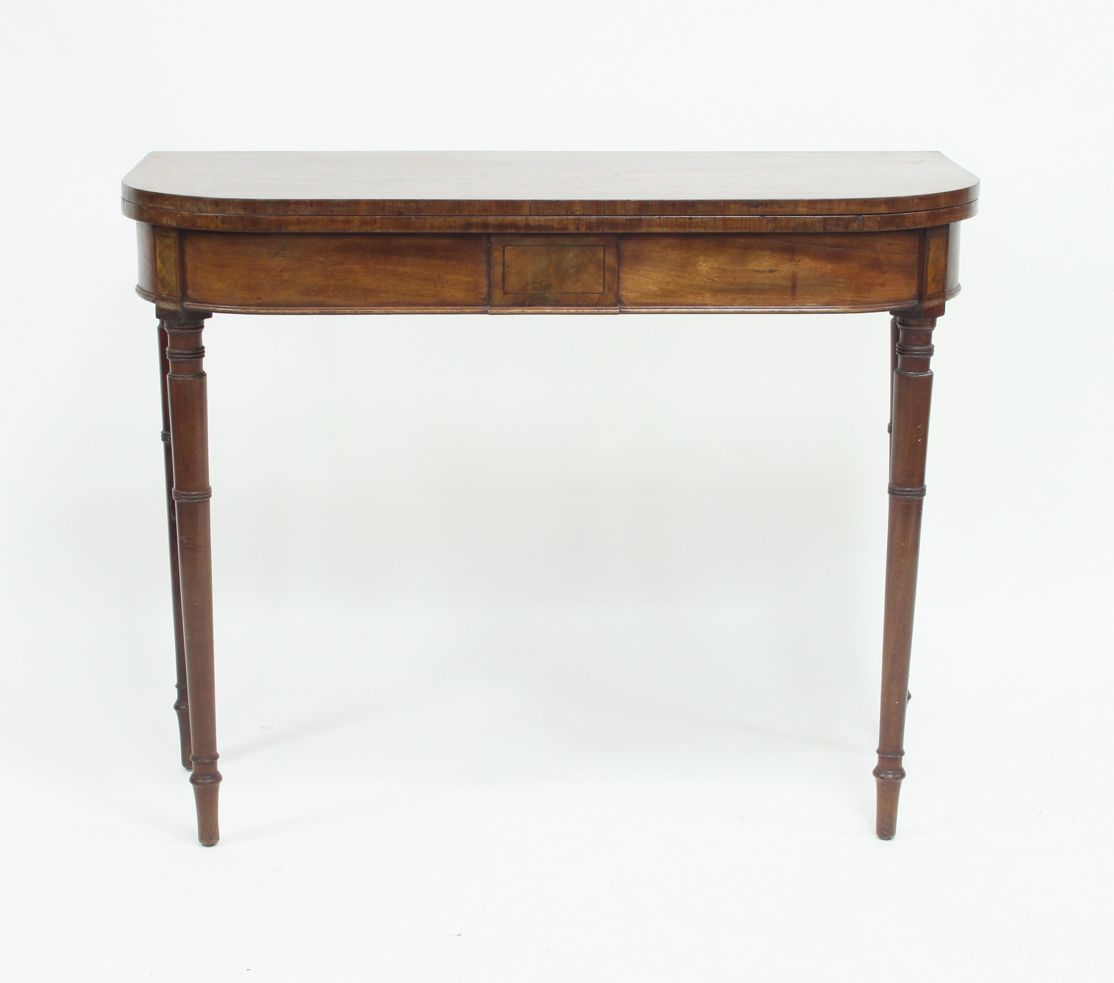 A mahogany D-shaped tea table on turned tapering legs