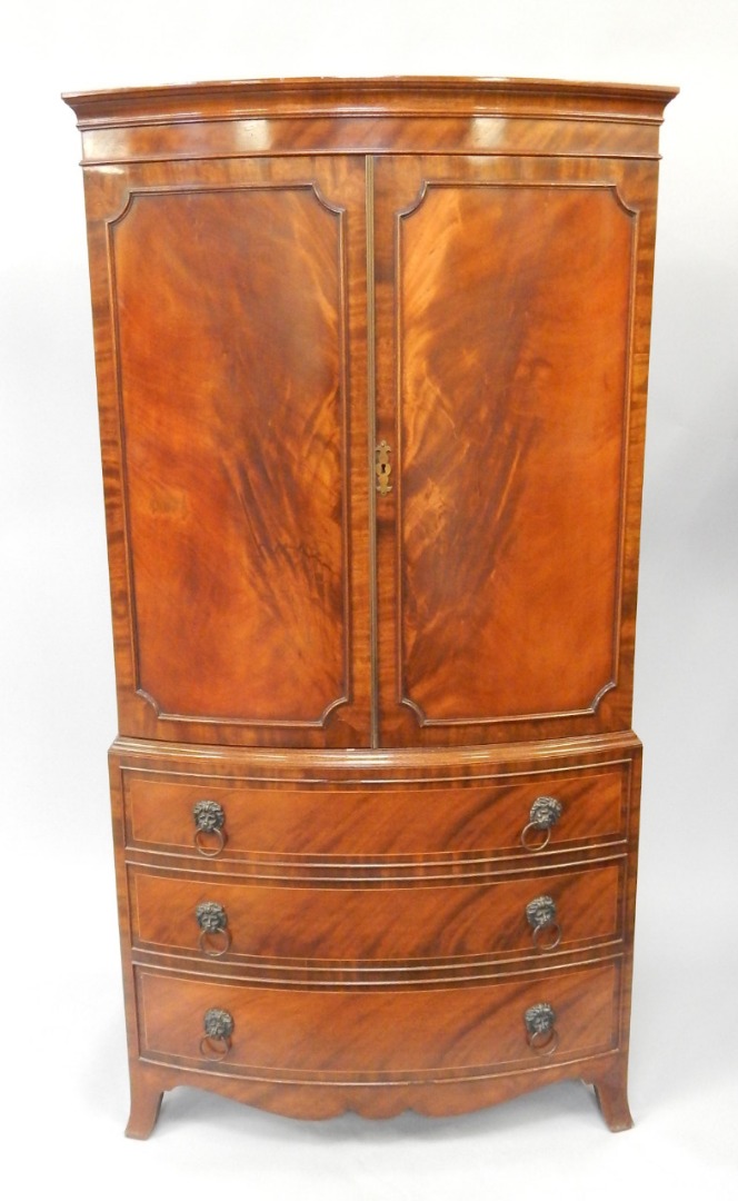 with lion mask handles, with cupboard to top, three drawers to base, on splay feet