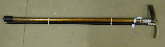 A Malacca cane and an ebony cane with horn handles and white metal mounts.