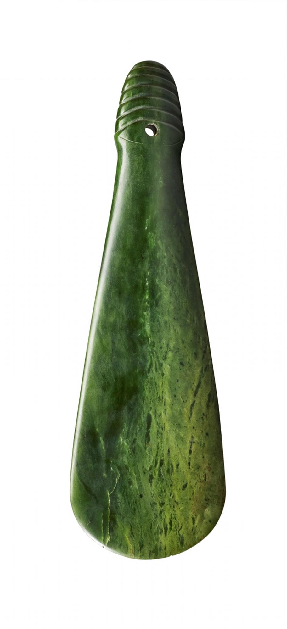 Patu pounamu, with flared blade and carved grooves to the pierced butt.