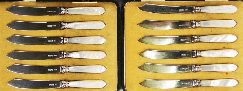 A matched set of twelve mother-o'-pearl handled fruit knives, cased, maker's mark of Walker & Hall Ltd, Sheffield 1922 and 1923