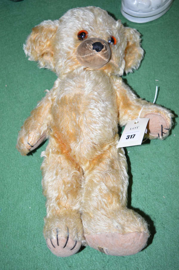 A Merrythought vintage teddy bear with glass eyes.