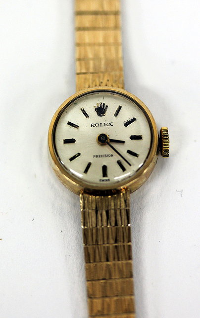 A MID 20TH CENTURY ROLEX PRECISION LADIES WRIST WATCH with a 9 carat gold strap, the dial 1.5cm diameter