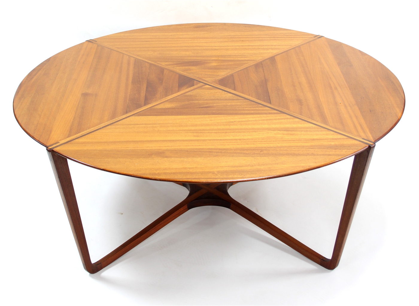 of circular form with inlaid cross section to top and banding within each quarter segment, on a stylised base of four legs with integral cross stretcher, 120cm diameter