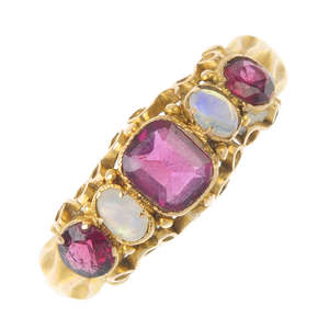 The rectangular-shape garnet collet, with oval opal cabochon and circular-shape garnet sides, to the scrolling gallery and plain band. Hallmarks for Birmingham, 1864. Ring size L 1/2. Weight 1.6gms.