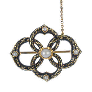 A mid Victorian 18ct gold, enamel and split pearl memorial brooch.