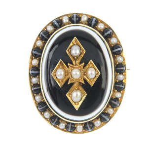 Of oval outline, the banded agate cabochon with applied cross set with split pearls, to the alternating banded agate cabochon and split pearl surround and a glazed panel to the reverse. Length 3.9cms. Weight 23.2gms.
