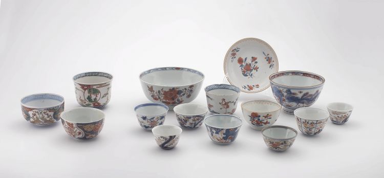 each loosely decorated to the centre with peonies, comprising: six tea bowls, in sizes, some damage; a Chinese tea bowl and saucer, 18th century; a Chinese 'Imari ' bowl, 18th century; three Chinese clobbered wares including a bowl and two tea bowls,