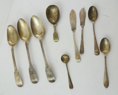 A MISCELLANY OF SILVER FLATWARE comprising; three fiddle pattern dessert spoons, two butter knives, two salt spoons and a caddy spoon, mixed assays, 186g