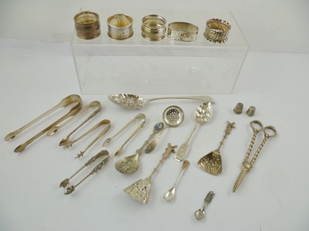 A MISCELLANY OF SILVER, SILVER COLOURED METAL AND PLATED ITEMS to include; a Georgian (later berried) table spoon, a pair of Georgian tongs, fruited teaspoon, five silver and one silver coloured metal napkin ring, three foreign silver coloured metaln