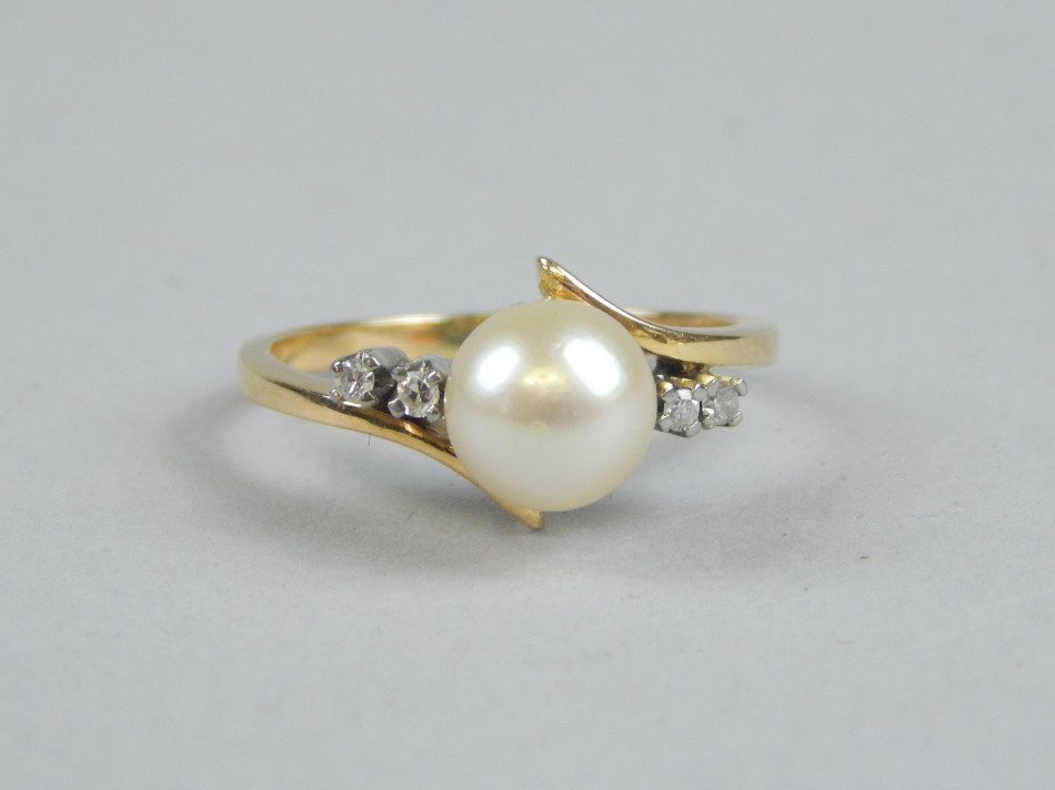 A modern dress ring, set with four tiny diamonds and a pearl, yellow metal, unmarked