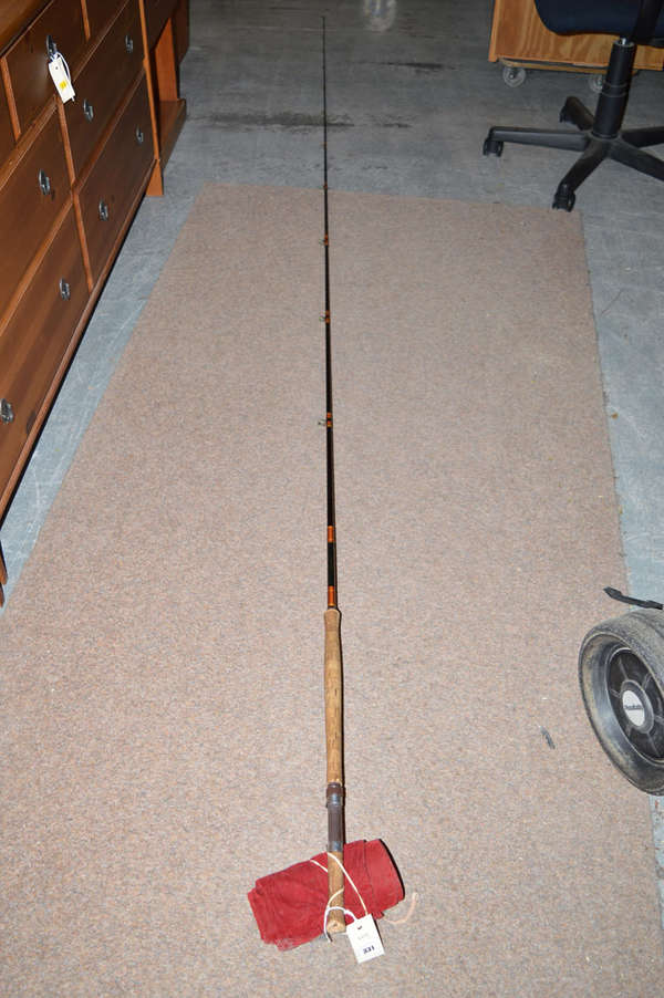 A modern Durham Ranger carbon fly fishing rod, 3mtr. in two sections, cork grip and red slip.