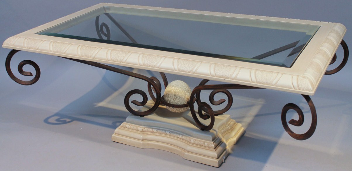 with rectangular outline part moulded raised on scroll metal supports terminating in an inverted platform base, decorated in cream, 50cm high, 119cm wide, 71cm deep.
