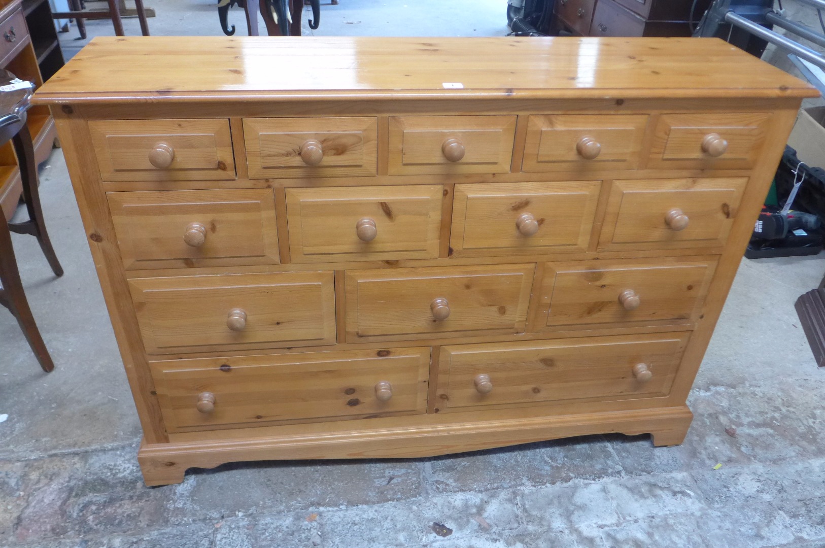 A modern pine chest with moulded top and an arrangement of fourteen drawers with turned handles on a shaped cornice