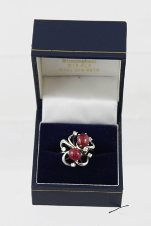 A MODERNIST RUBY AND DIAMOND DRESS RING, having two rubies and six satellite 8/8 cut diamond head in rhodium finished white gold coloured metal claw setting, size L