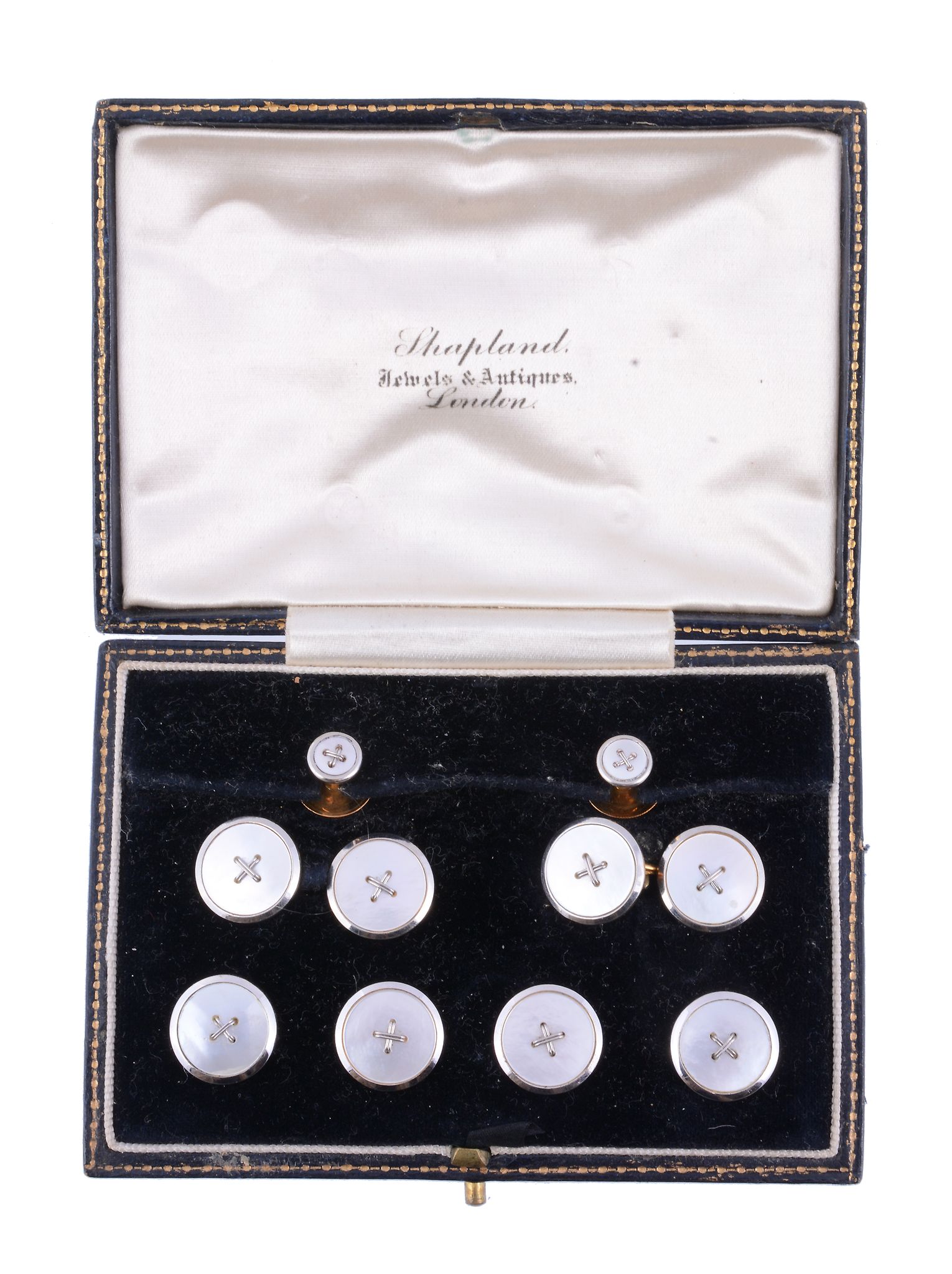 comprising: a pair of mother of pearl cufflinks, the circular mother of pearl panels in polished settings, stamped 18ct & pt, 1.4cm diameter; together with four matching buttons and two dress studs