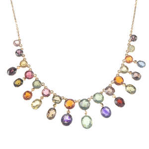 The necklace designed as a graduated cushion-shape vari-gem fringe to the filed trace-link chain, the ear studs each designed as a diamond and pink tourmaline floral cluster. Length of necklace 40cms. Diameter of ear studs 1cm. Weight 11.6gms.