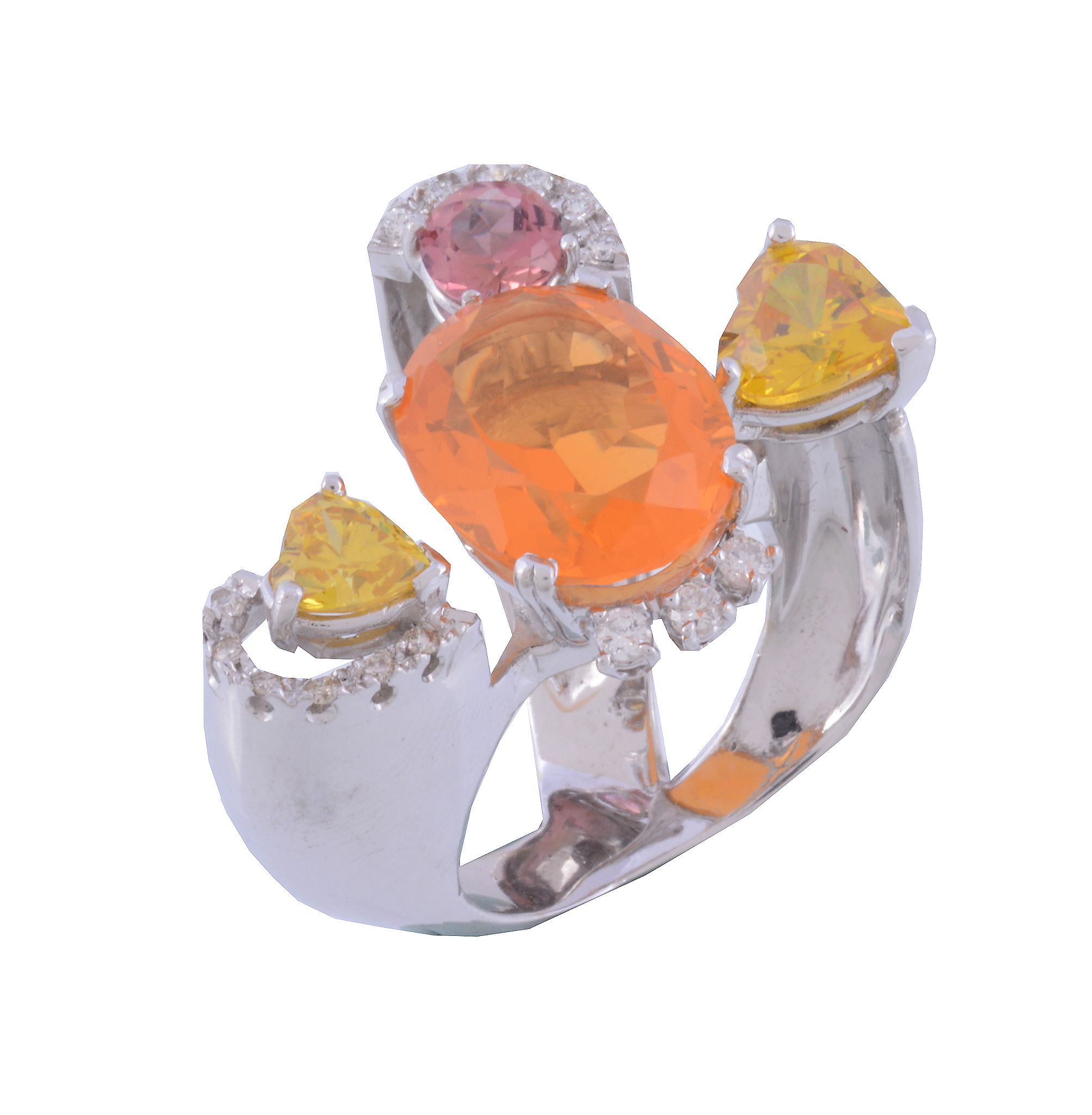 the oval shaped fire opal claw set with brilliant cut diamond accents, between two heart shaped yellow stones and a circular shaped pink tourmaline, finger size N 1/2