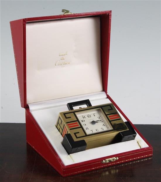 with stylised Greek key decoration and arabic dial, 4in., in original Cartier fitted case