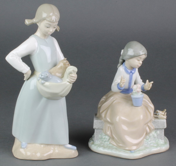 A Nao figure of a girl sitting on a wall beside 2 birds 7" and a ditto of a girl with kittens in her apron 9"