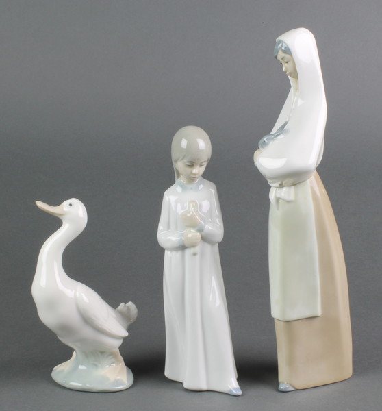 A Nao figure of a lady holding a rabbit 10 1/2", a ditto of a girl in nightwear 8" and another of a standing goose