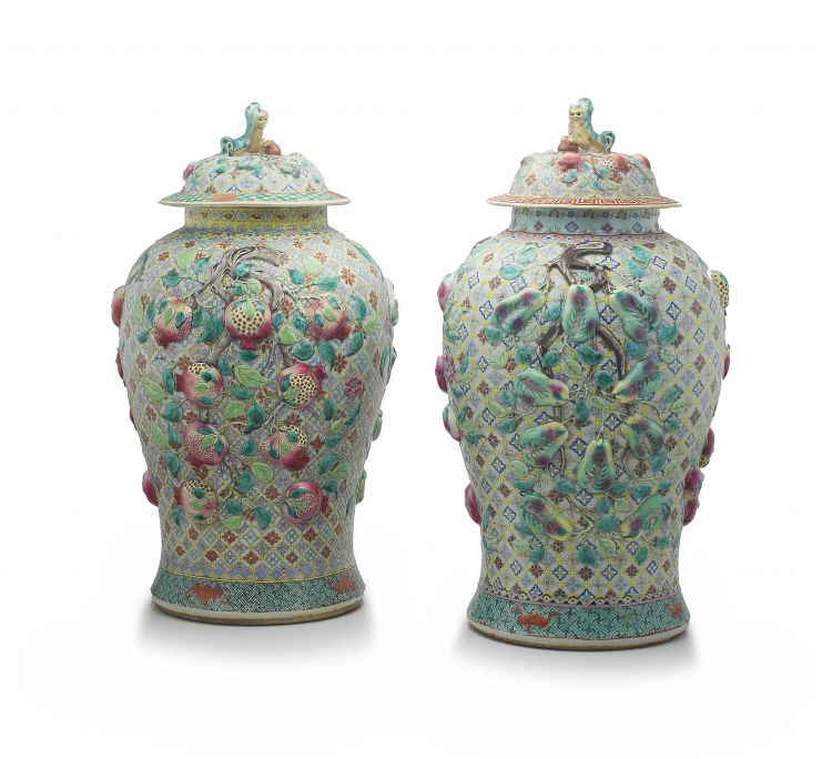 each baluster body moulded in high relief with three flowering branches of fruit, including peaches, pomegranate and fingered citron, against a flowerhead diaper ground, between foliate and leiwen ground highlighted with bats, each cover similarly mo