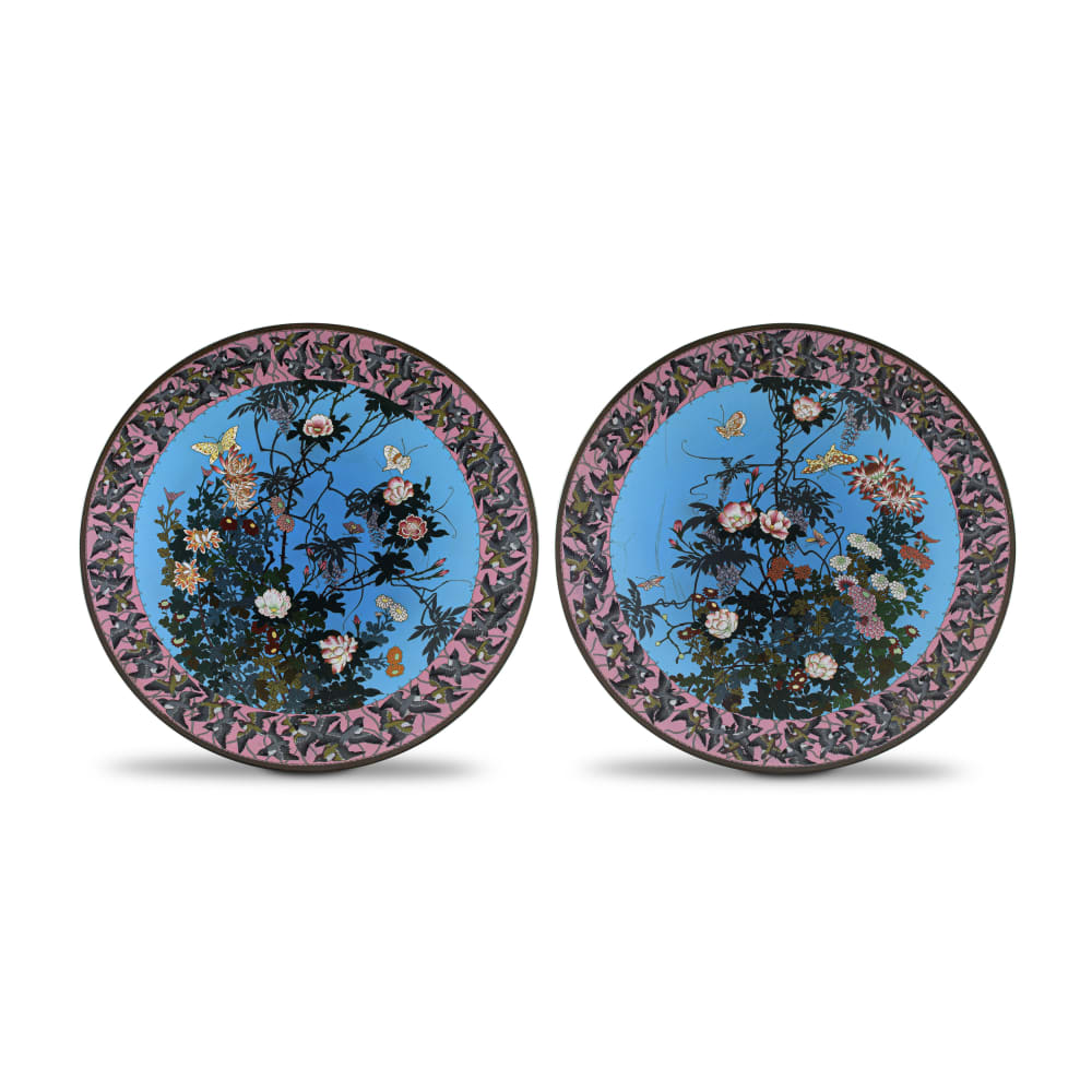 A near pair of large Japanese cloisonné chargers, late Meiji/Tasho period, early 20th century