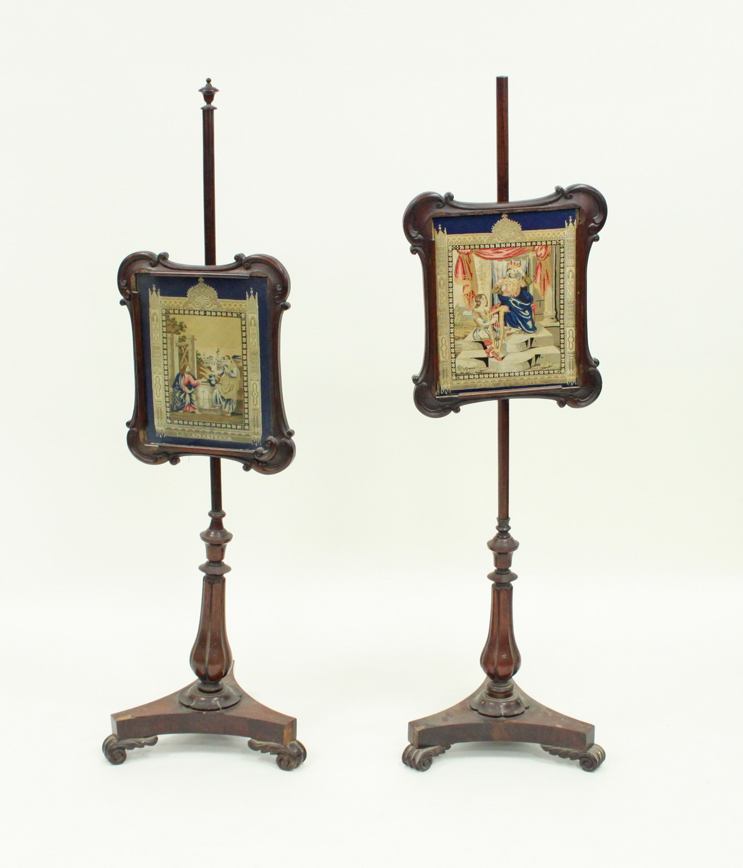 each mounted with a petit point needlework within a shaped rectangular screen, on a tripod base with scroll feet
